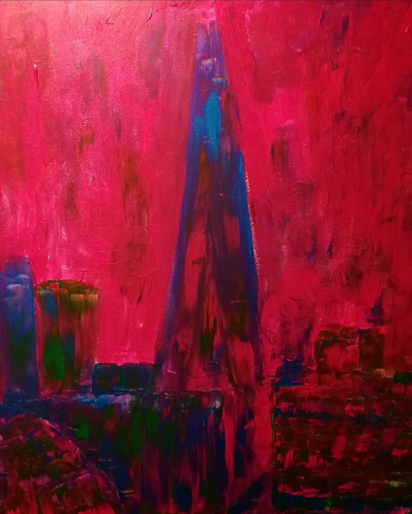 This piece is part of a series of cityscapes exploring narratives around human emotional or social constructs – whether that be a reaction against physical objects or structures, or something entirely imagined. This piece explores the energy and emotion of city life, specifically London, and how our emotional connection to the spaces we inhabit and the experiences we have within cities can be superimposed onto buildings and structures, which become both the scaffold for experience but also remote and removed bystanders in the scenes.